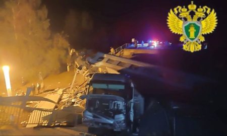 At least seven people were killed when a road bridge collapsed onto a passenger train in western Russia late Saturday, with railway...